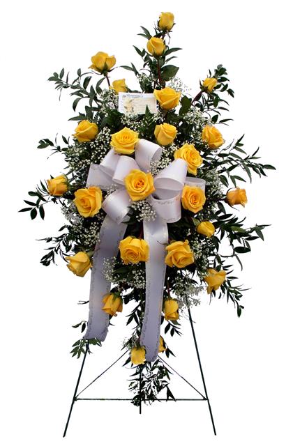 Hoa Hồng Vàng được thiết kế thật chu đáo trên cây đứng với trên 25 hoa hồng cao cấp được xen kẻ những hoa phụ màu trắng và tô điểm với màu lá cây xanh của ư đại lợi. Ṿng hoa lư tưởng để phân ưu cùng người thân