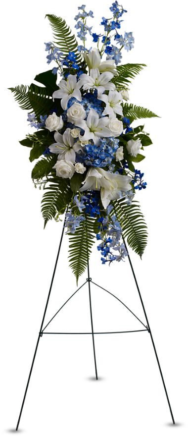 Giống như một làn gió mát của đại dương, hoa tang lễ sắp xếp màu rất mát mắt như hoa màu trắng và màu xanh bao gồm hoa hồng, hoa bách hợp và cây phi yến, ngọc tú cầu được tô điểm với lá dương xỉ sẽ mang lại một cảm giác thoải mái cho dịp tang lễ này. Khoảng 28" H x 19" W chưa tính trên cây đứng.