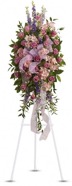 Những bông hoa trang nghiêm như hoa hồng hoa oải hương, layon và ngọc tú cầu, hoa lan tím và lily trắng phương Đông và nhiều hơn nữa. • Khoảng 40" H x 27" W Kích thước chưa tính trên cây đứng cao trên 60 inches