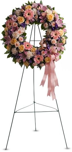 Hoa hồng, hoa đồng tiền và hoa cẩm chướng, hoa lily hồng, châu Á và cat tường, cùng với hoa phụ màu tím và cây phi yến được bao phủ bởi lá xan làm nền được tŕnh bày trên một ṿng hoa gắn trên cây đứng ba chân, lư tưởng cho một dịp tang lễ. •Cao và rộng Khoảng 22" dia.
