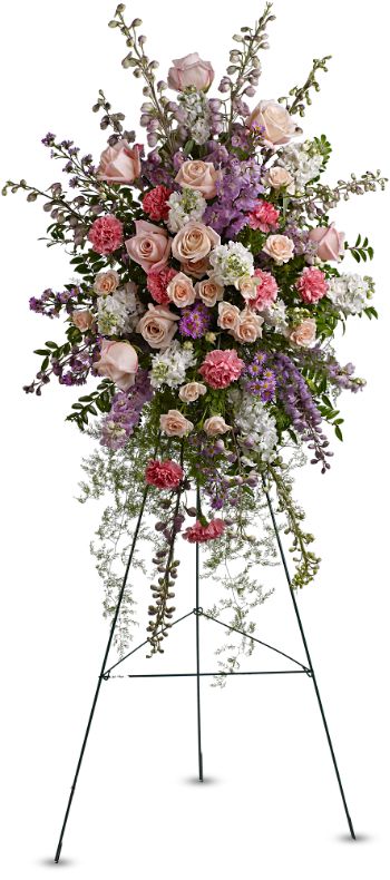 Vòng hoa tang lễ lớn với hoa hồng, hoa cẩm chướng, cây phi yến và nhiều hơn nữa có thể được giao trực tiếp cho một nhà tang lễ. Hoa hồng, hoa cẩm chướng, cây phi yến, Monte Cassino asters và nhiều hơn nữa - trong sắc thái của màu hồng, tím và trắng. Khoảng 38" H x 26" W Kích thước chưa tính trên cây đứng cao trên 54 inches